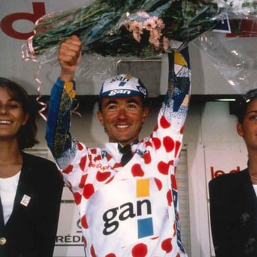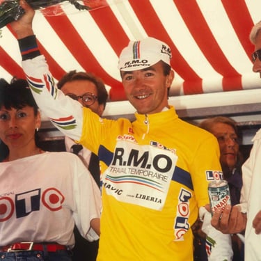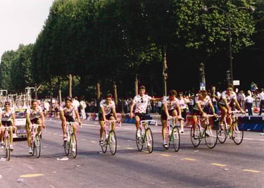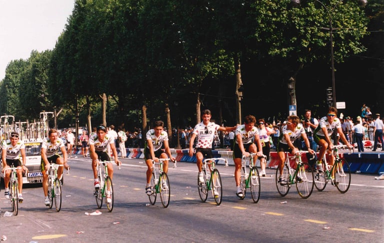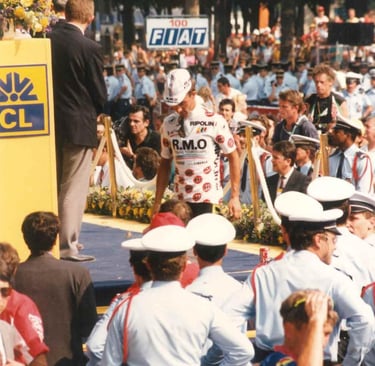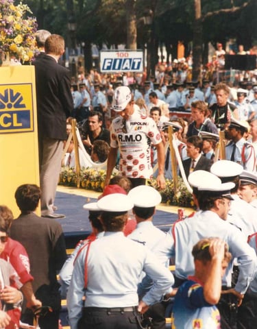 Le 22 juillet 1990, une journée inoubliable marque l'histoire de Thierry Claveyrolat. Accompagné de ses coéquipiers de l’équipe RMO, ils défilent avec élégance sur les Champs-Elysées. Thierry Claveyrolat se distingue avec son maillot à pois, célébrant son succès et inscrivant à jamais son nom dans les annales du cyclisme.