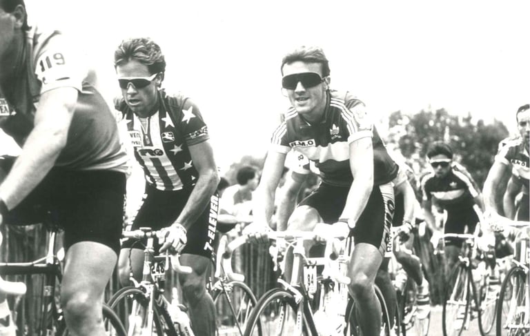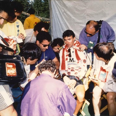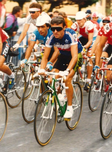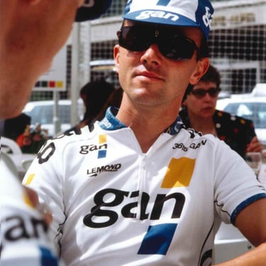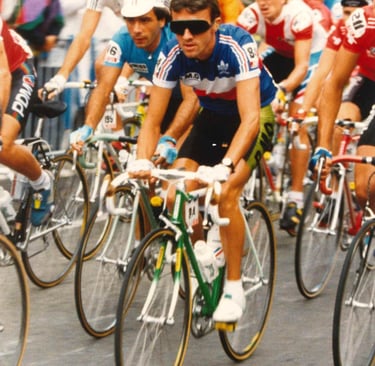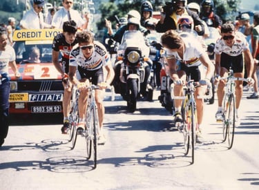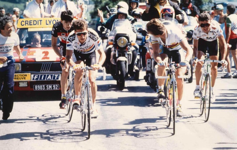 Le 11 juillet 1990, sur la 11ème étape du Tour de France, Thierry Claveyrolat se lance à l'assaut de la célèbre montée de l'Alpe d'Huez, accompagné de véritables légendes du cyclisme. Aux côtés de Giagni Bugno (visible à gauche à l'arrière), Miguel Indurain (présent devant à gauche), et Greg LeMond (positionné au centre), Claveyrolat écrit une nouvelle page dans son parcours. Malgré une performance exceptionnelle, il termine à la 4ème place, ne laissant filer la victoire que de peu, à seulement 4 secondes du leader.